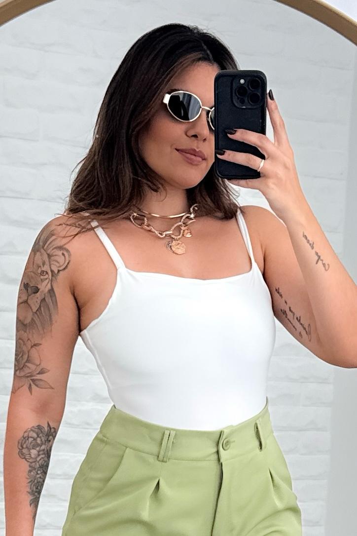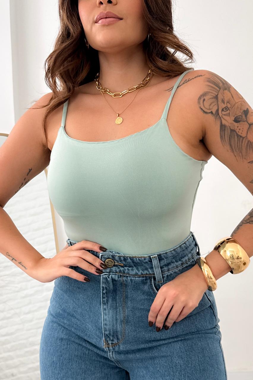 Body em suplex, abertura na parte inferior, forrado na parte do busto e fechado nas costas.