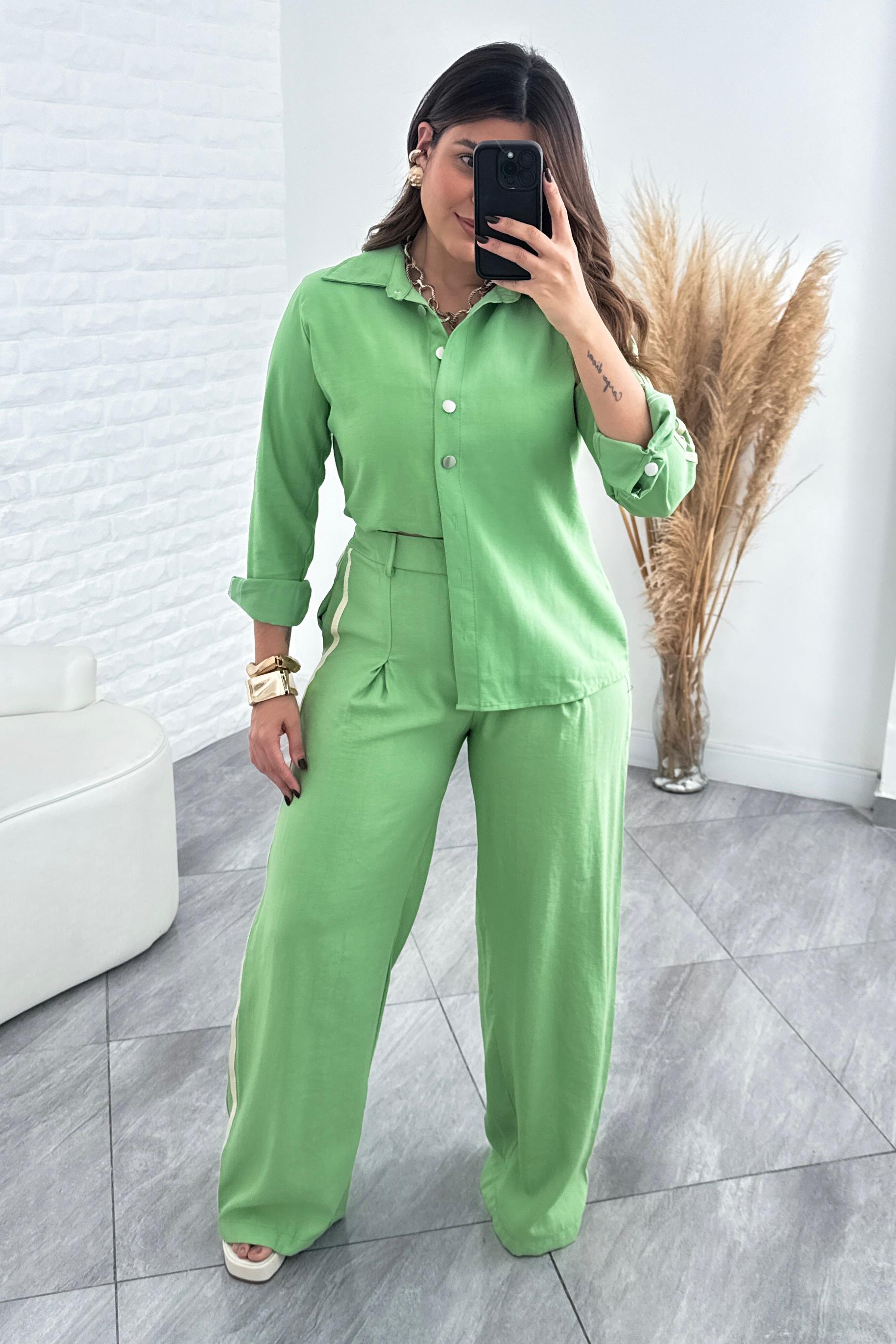 Conjunto Maluri é um modelo moderno e confortável, composto por calça e blusa com botões.