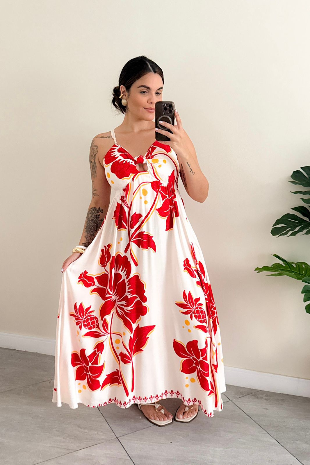 O vestido longo floral é a escolha ideal para quem busca um visual leve, feminino e cheio de charme. Com alças finas e delicada amarração frontal no busto, o modelo valoriza o colo de forma elegante, enquanto a modelagem soltinha garante conforto e fluidez ao vestir.