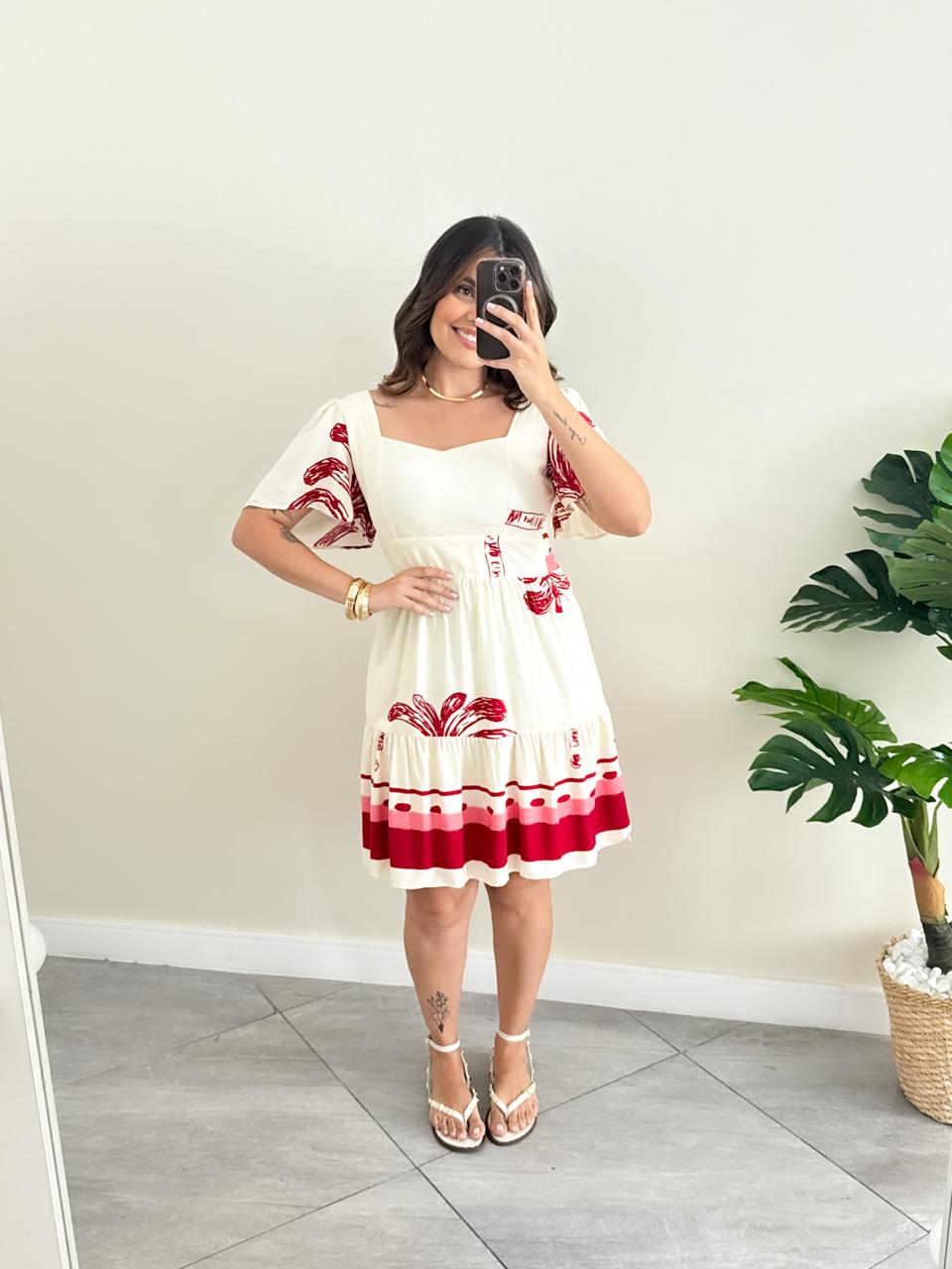 Vestido feminino curto com estampa tropical delicada, ideal para looks leves e frescos. Possui decote quadrado que valoriza o colo, mangas curtas amplas e cintura marcada, garantindo um caimento confortável e feminino. A saia em camadas traz movimento e charme à peça, enquanto o tecido leve proporciona conforto ao longo do dia. Perfeito para compor produções de verão, passeios ao ar livre, viagens ou ocasiões casuais com um toque elegante.